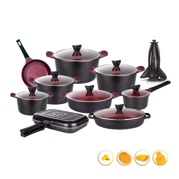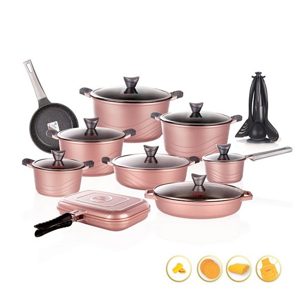 | ست شامل | قابلمه سایز16+قابلمه سایز20+قابلمه سایز 24+قابلمه سایز 28+قابلمه سایز32+تابه دو دسته سایز28+تابه تک دسته سایز20+تابه بیضی سایز32+تابه دوبل سایز34+هفت پارچه کفگیر و ملاقه |