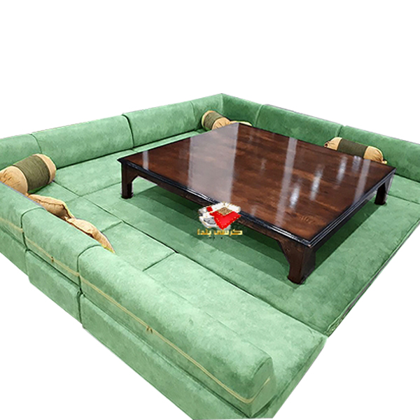 | ست شامل | مبل 12 نفره، میز جمعشو، صفحه رنگی، لحاف ترمه ابریشم، 7 عدد بالش، تشک همسطح، هیتر ایرانی |