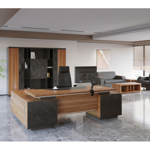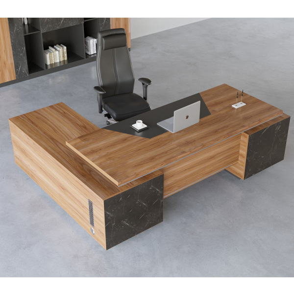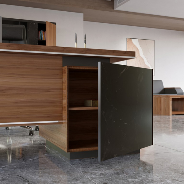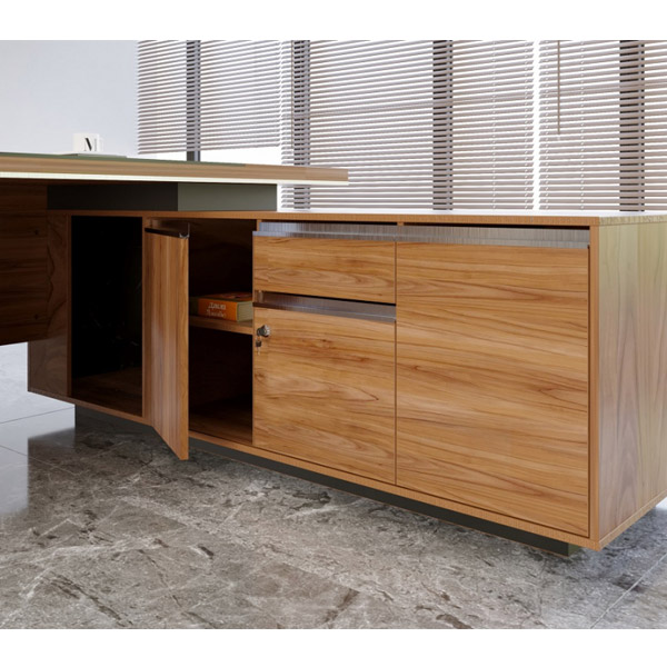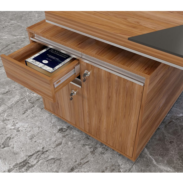 قابلیت سفارش با مدیا باکس، اتصالات پایه ها، صفحه ها و کشوها از نوع الیت، استفاده از MDF طرح سنگ برروی نمای فایل و ساید میز، ساختار صفحات ضخیم بصورت Honeycombs می باشد، ضخامت صفحه رویی 48 میلی متری، کمدها بصورت دو طبقه و دارای لولای ساده آرام بند