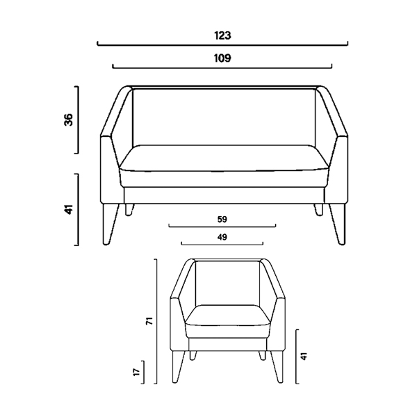 • طول نشیمن: دو نفره: 109 cm، یک نفره: 49 cm